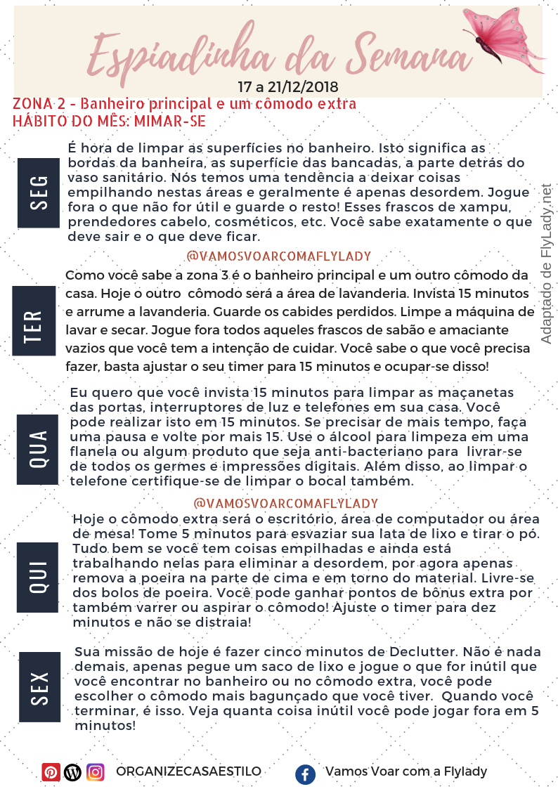Aproveitem a Espiadinha da Semana e programem-se para a realização das missões Fly! Para entender o que é a espiadinha e como ela se encaixa no sistema FlyLady, leia aqui.