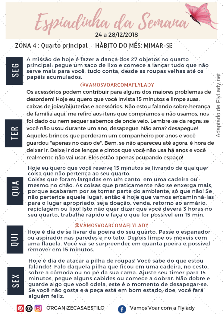 Aproveitem a Espiadinha da Semana e programem-se para a realização das missões Fly! Para entender o que é a espiadinha e como ela se encaixa no sistema FlyLady, leia aqui.