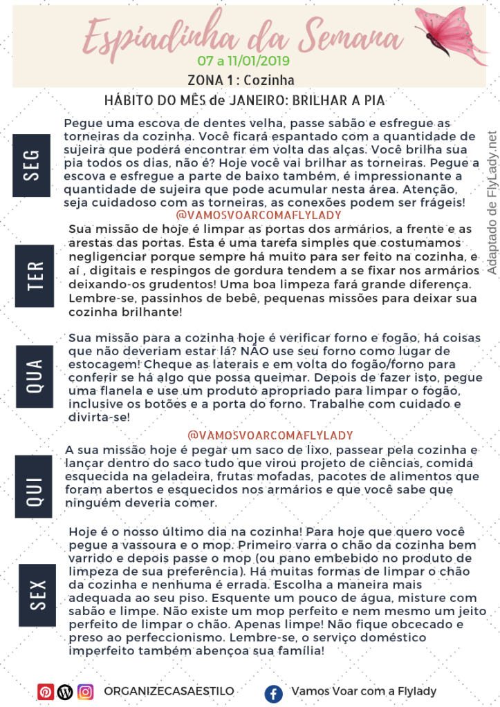 Aproveitem a Espiadinha da Semana e programem-se para a realização das missões Fly! Para entender o que é a espiadinha e como ela se encaixa no sistema FlyLady, leia aqui.