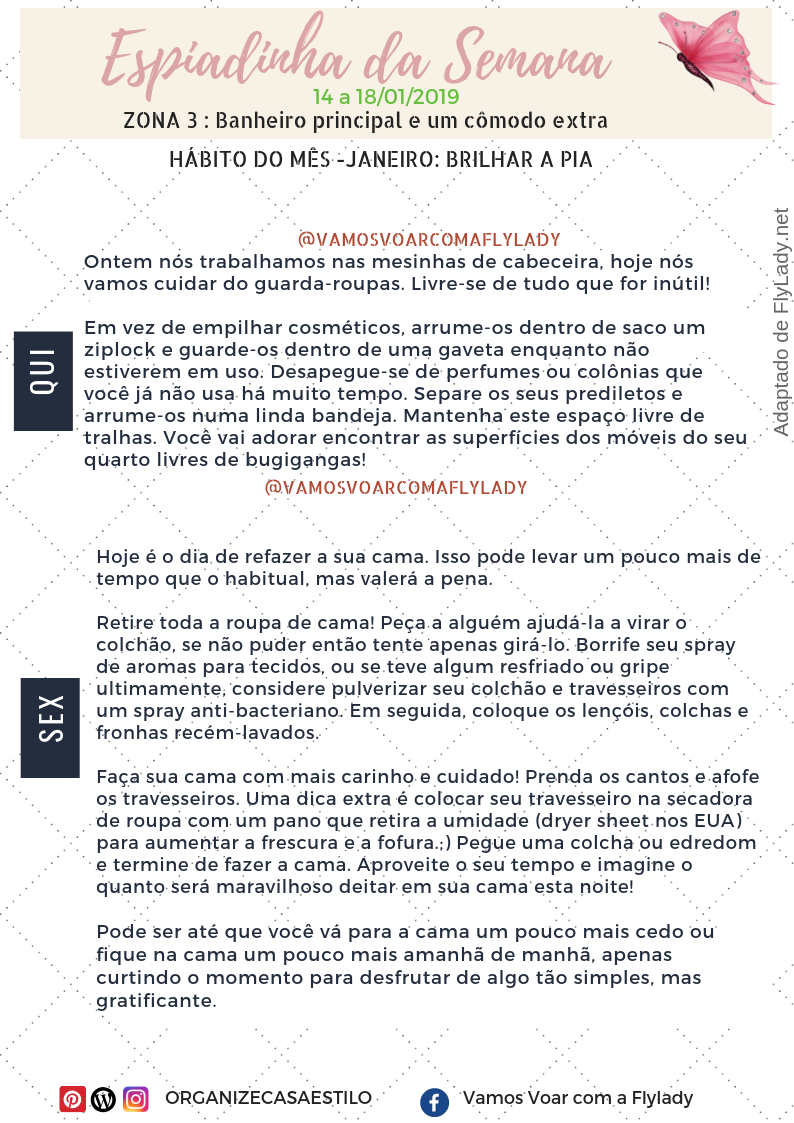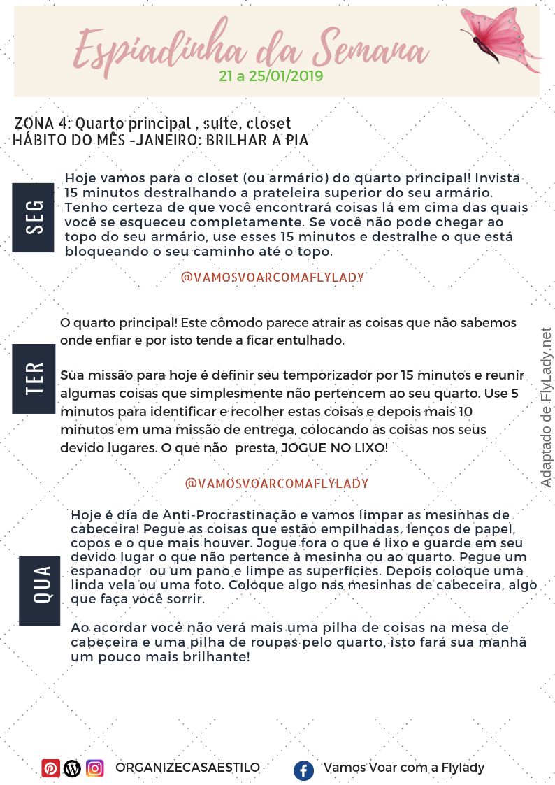 Aproveitem a Espiadinha da Semana e programem-se para a realização das missões Fly! Para entender o que é a espiadinha e como ela se encaixa no sistema FlyLady, leia aqui.
