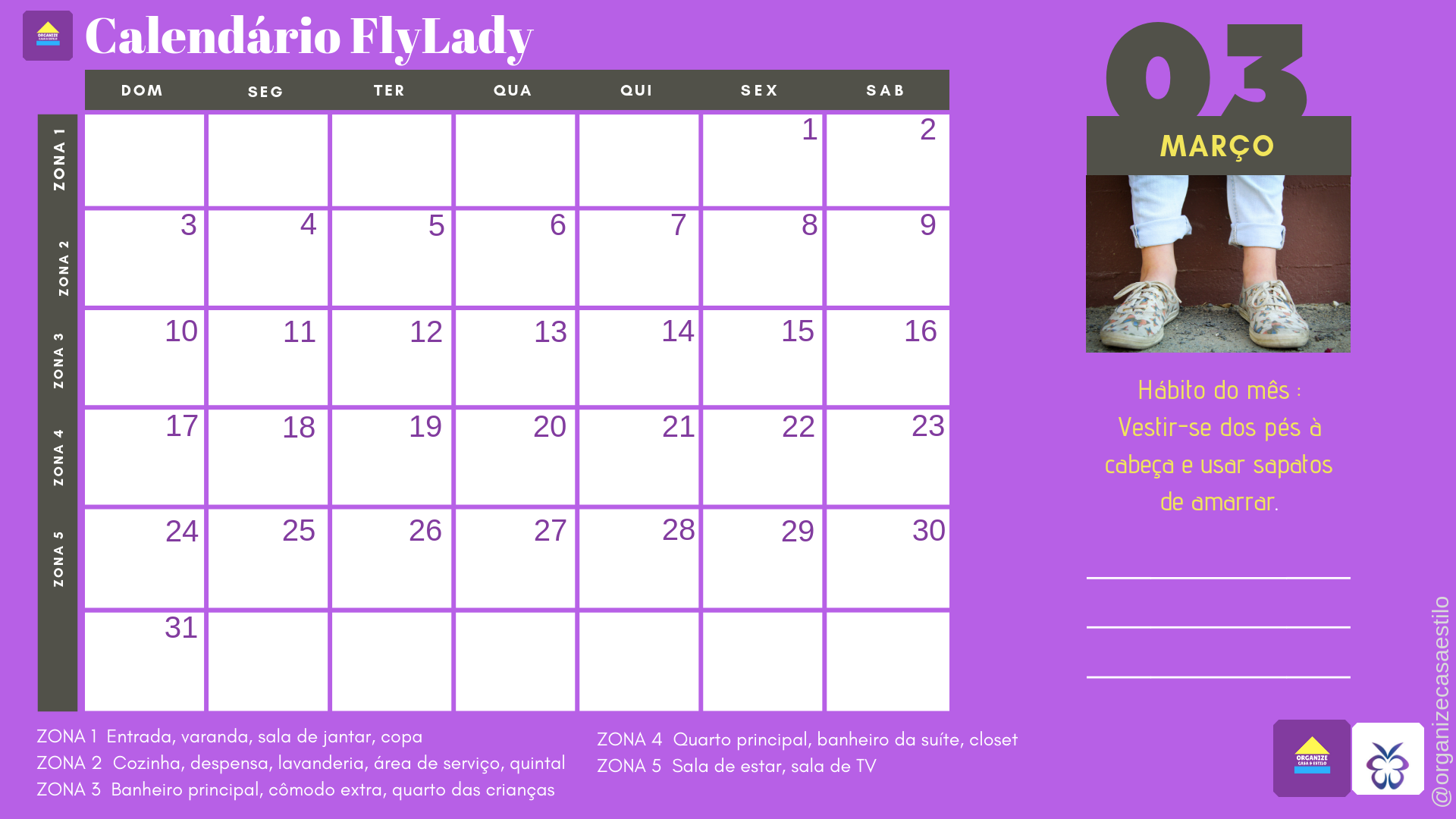 Vamos dar uma forcinha pra você, um mimo: o calendário de março com as zonas da FlyLady , que tal? Ele tem espaço para anotação pra você ir marcando o que já fez ou acrescentar o que achar necessário, quem sabe o nome do filho adolescente que está doido pra colaborar? hahaha