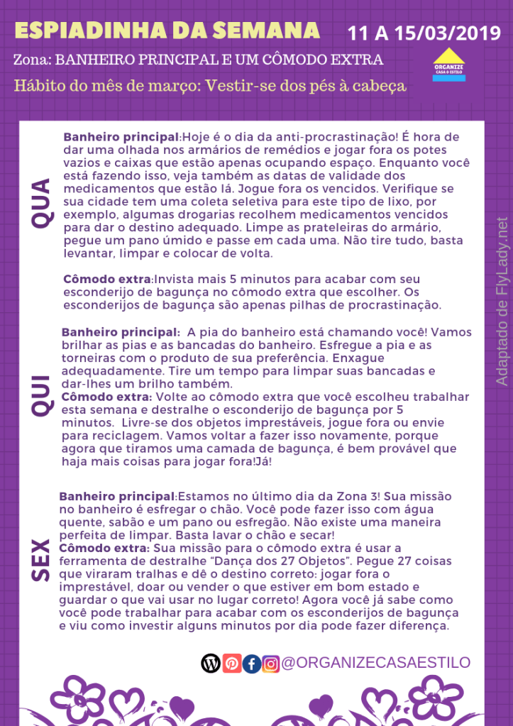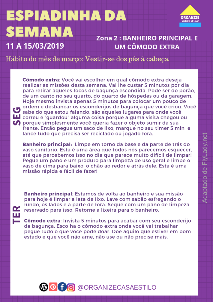 Esta semana vamos trabalhar na zona 3: banheiro principal e um cômodo extra. O cômodo extra, desta vez, você vai escolher, então dê preferência àquele que tiver mais bagunça camuflada, porque esta será o foco das missões neste cômodo. Para rever a divisão da casa em zonas, leia aqui.