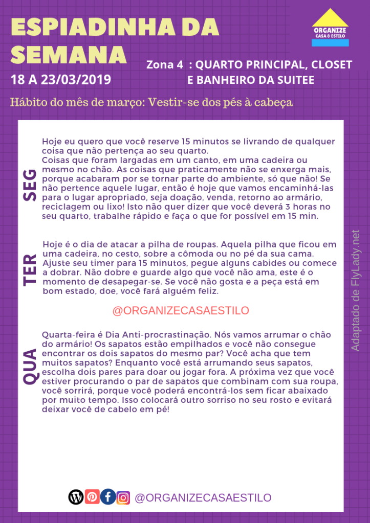 Esta semana vamos trabalhar na zona 4: quarto principal, closet e banheiro da suíte. Para rever a divisão da casa em zonas, leia aqui.