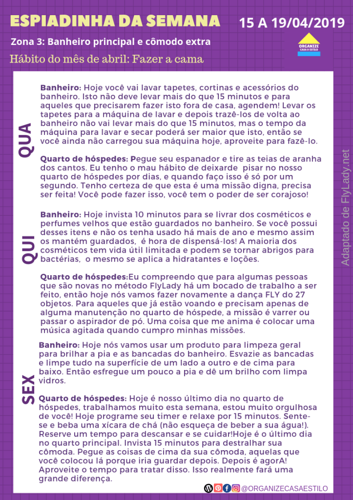 Esta semana vamos trabalhar na zona 3: banheiro principal e um cômodo extra. O cômodo extra selecionado este mês pela Flylady foi o quarto de hóspedes, mas se você não tiver um, escolha outro, o quarto das crianças, por exemplo. Para rever a divisão da casa em zonas, leia aqui.