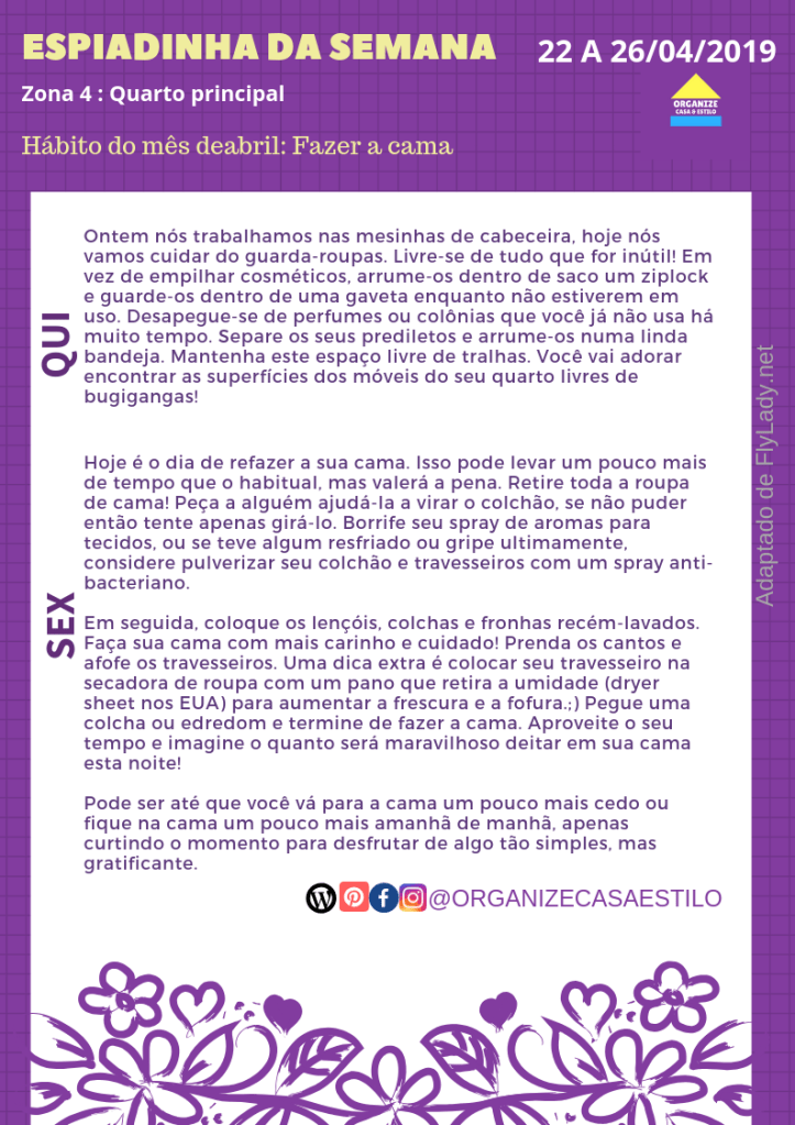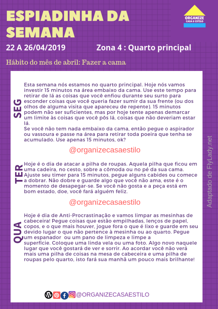 Aproveitem a Espiadinha da Semana e programem-se para a realização das missões Fly! Para entender o que é a espiadinha e como ela se encaixa no sistema FlyLady, leia aqui.