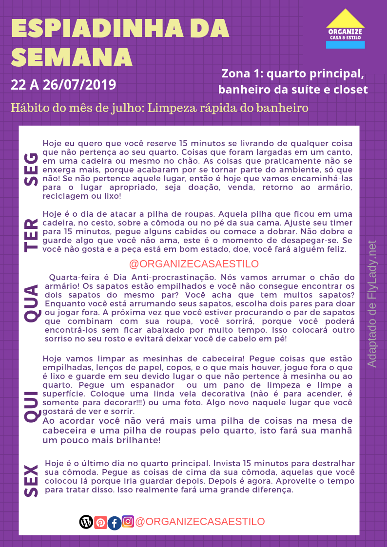 Esta semana vamos trabalhar na zona 4: o quarto principal, banheiro da suíte e closet! Repare que as missões são variadas e mesmo que você não guarde os sapatos no chão do armário, por exemplo, faça adaptações! Vá até o canto onde você deixa seus sapatos e verifique se tem algum pra ser doado ou outro pra ser levado ao sapateiro e já deixe separados.
