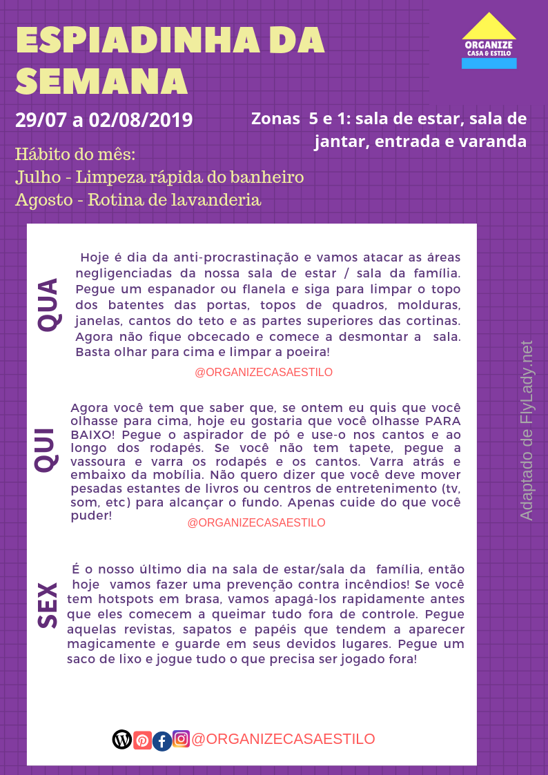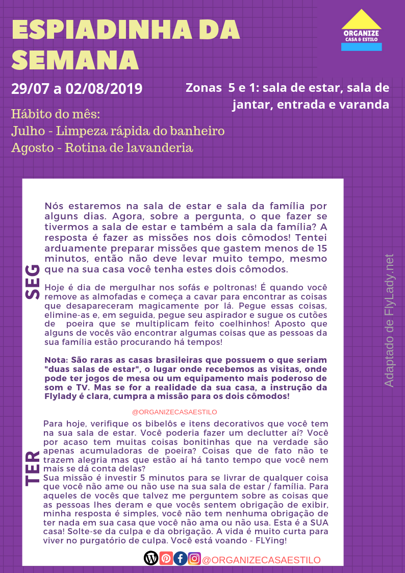Estamos numa semana de transição entre dois meses, julho e agosto, portanto teremos duas zonas para trabalhar: as salas da casa! Sala de jantar com copa e sala de estar (e sala da família, se houver). Claro tem a entrada e a varanda também. Mas calma, mesmo que a sua casa seja assim tão grande , com todos estes cômodos, vamos dividir as tarefas bem direitinho!