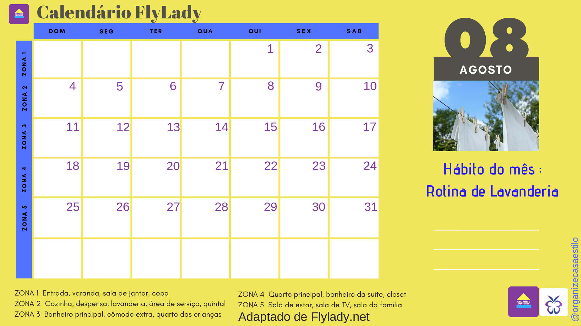 Aproveite que trouxemos um mimo pra você: o calendário de agosto prontinho pra você usar programando suas tarefas! Veja as zonas da FlyLady pra trabalhar a cada semana , que tal?