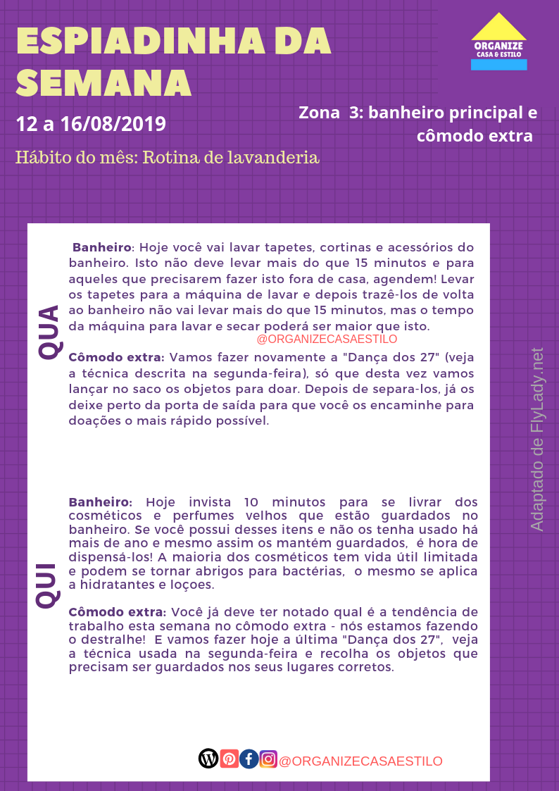 Como vocês já sabem, em agosto, o hábito a ser reforçado é a Rotina de Lavanderia. Para começar a relembrar este assunto reveja o Babystep em que tratamos da lavanderia pela primeira vez.