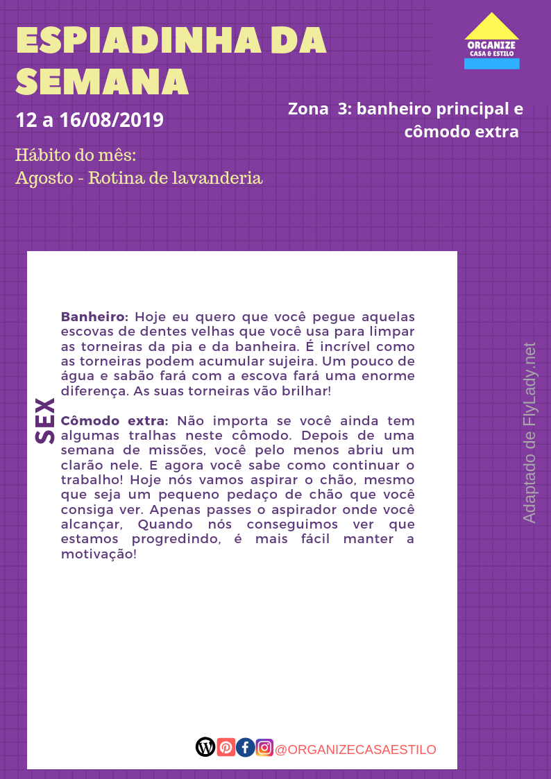 Nesta semana vamos dar atenção especial ao banheiro principal e também a um cômodo extra. O cômodo extra pode ser aquele que você considera o mais bagunçado. Para a maioria das pessoas é o quarto de hóspedes, qual o cômodo mais desorganizado da sua casa?