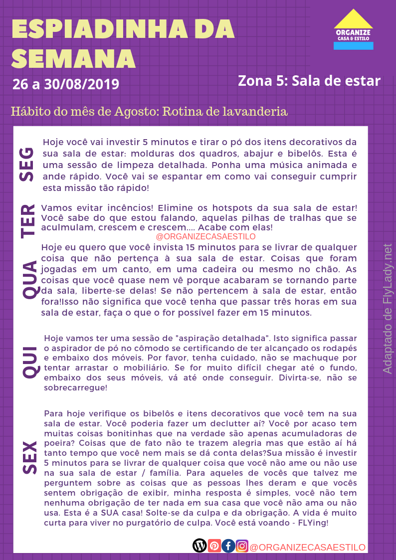 Nesta semana vamos dar atenção especial à sala de estar. Será grande ajuda para deixar este ambiente prontinho para receber suas visitas com tranquilidade.