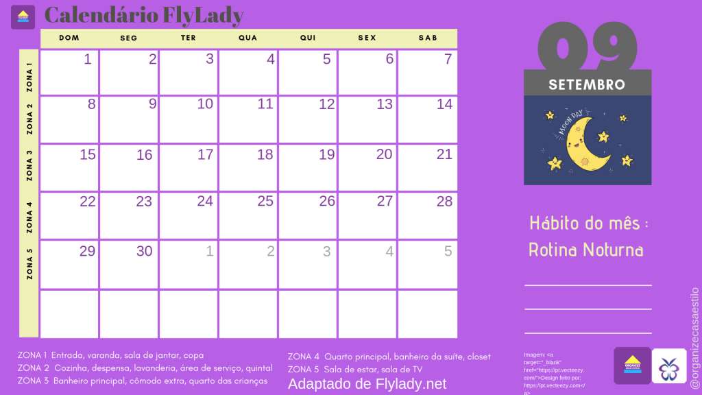 Eis que trouxemos para você o calendário de setembro prontinho pra você usar . Programe suas tarefas com antecedência! Veja as zonas da FlyLady para cuidar a cada semana , que tal?