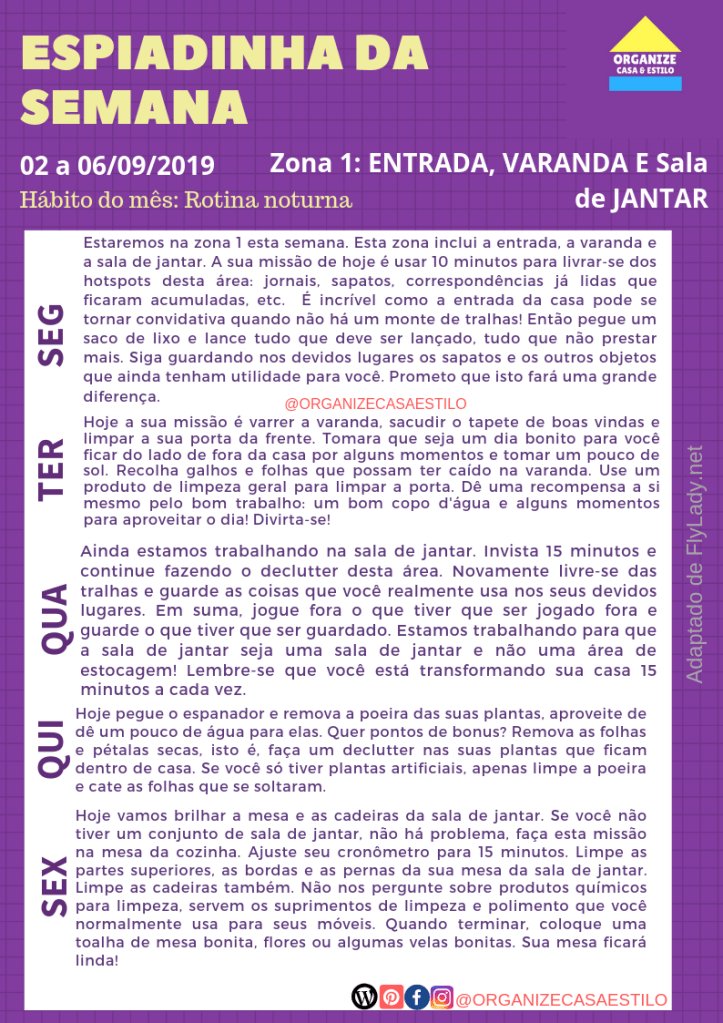 Nesta semana vamos dar atenção especial à Zona 1 – entrada, varanda e sala de jantar. Será grande ajuda para deixar este ambiente prontinho para receber suas visitas com tranquilidade.