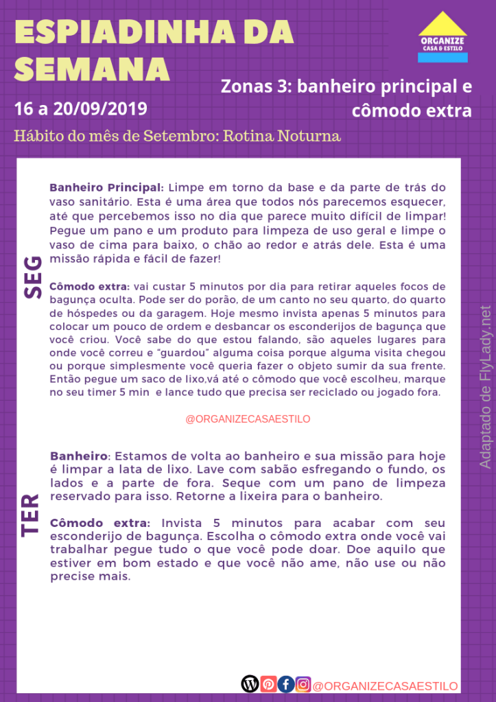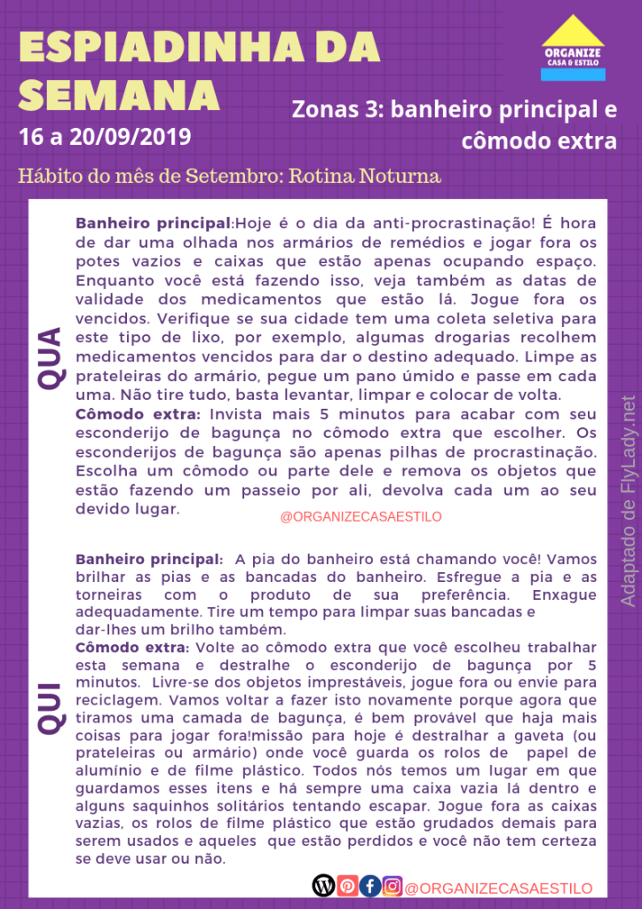 Nesta semana vamos dar atenção especial à Zona 3 – Banheiro principal e um cômodo extra . No cômodo extra, cuidaremos das bagunça oculta, ou seja, aqueles objetos que enfiamos em algum canto porque alguma visita apareceu de repente ou simplesmente porque estávamos com preguiça de devolver ao lugar correto. Você sabe onde esconde a sua bagunça, não sabe?