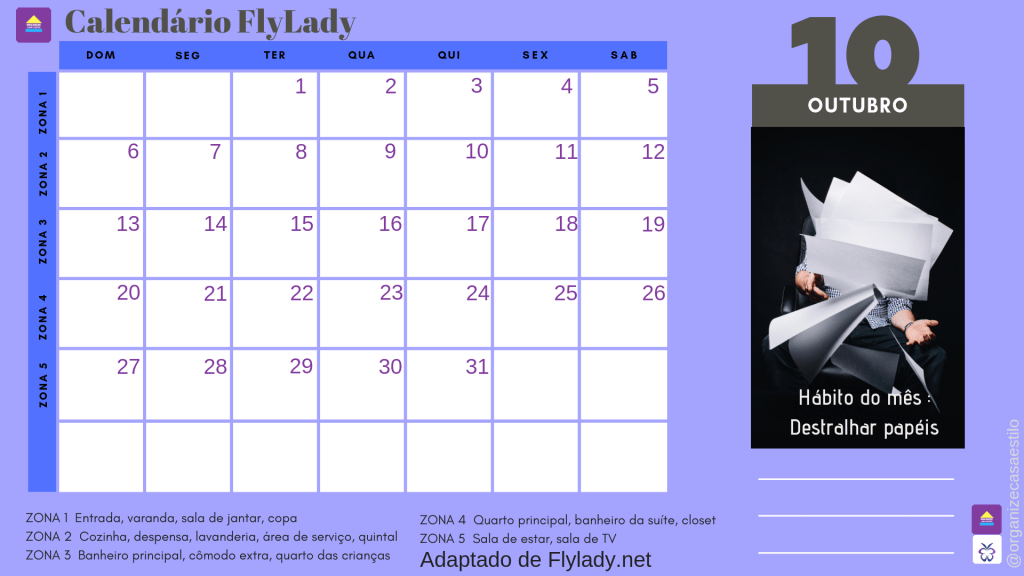 O calendário de outubro está prontinho pra você usar! Programe suas tarefas com antecedência! Veja as zonas da FlyLady para cuidar a cada semana , que tal?
