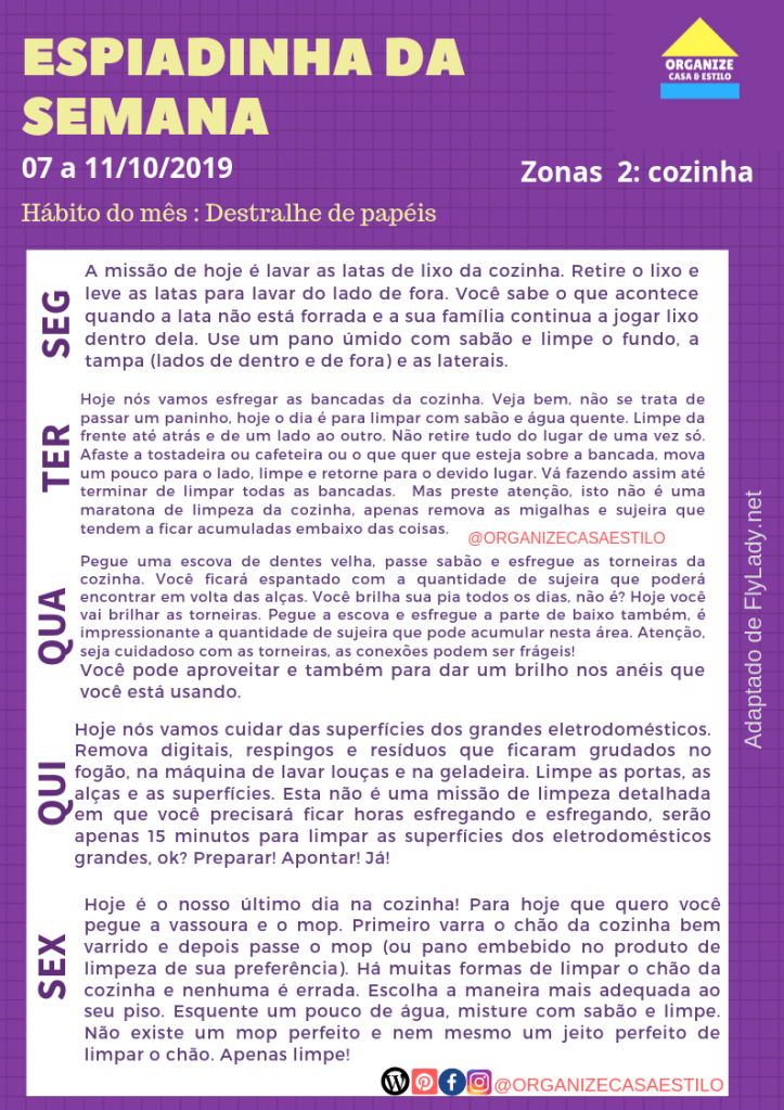 Aproveitem a Espiadinha da Semana e programem-se para a realização das missões Fly! Para entender o que é a espiadinha e como ela se encaixa no sistema FlyLady, leia aqui.