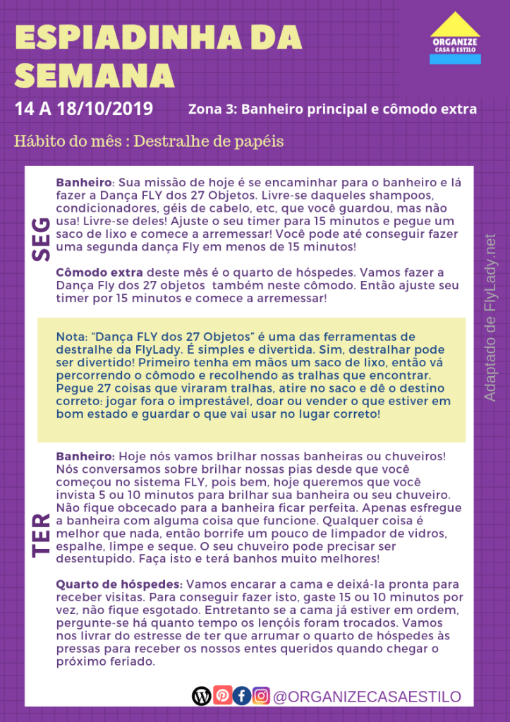 Aproveitem a Espiadinha da Semana e programem-se para a realização das missões Fly! Para entender o que é a espiadinha e como ela se encaixa no sistema FlyLady, leia aqui.