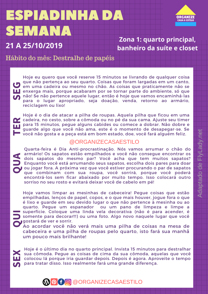 Aproveitem a Espiadinha da Semana e programem-se para a realização das missões Fly! Para entender o que é a espiadinha e como ela se encaixa no sistema FlyLady, leia aqui.