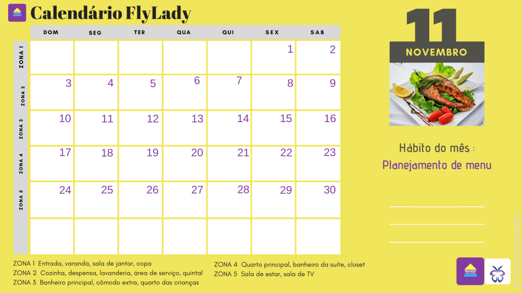Veja o calendário de novembro! Programe suas tarefas com antecedência! Observe as zonas da FlyLady para cuidar a cada semana , que tal?