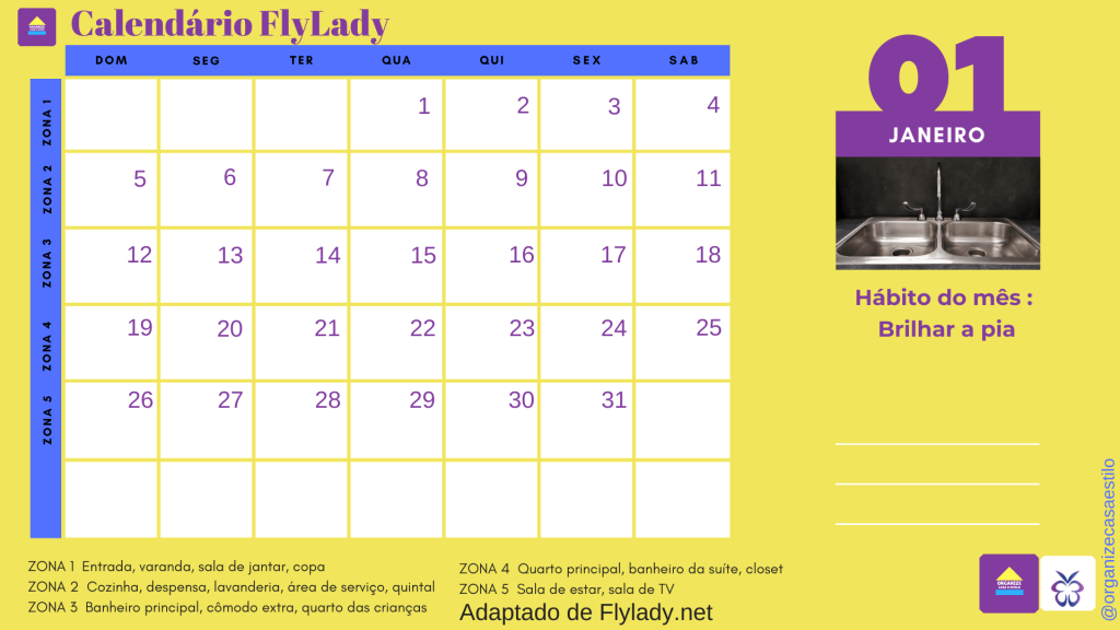 Aproveite que trouxemos um mimo pra você começar 2020 a todo vapor: o calendário de janeiro prontinho pra você usar programando suas tarefas! Veja as zonas da FlyLady pra trabalhar a cada semana , que tal?