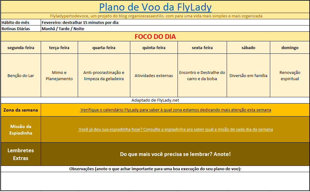 Abaixo segue uma tabela com a visão panorâmica do mês de fevereiro de acordo com a estrutura do plano de voo . Use todos os dias! Você pode adaptar para melhor atender à dinâmica do seu lar.