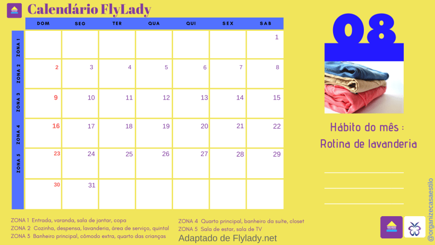 Aproveite o nosso calendário de agosto e programe suas tarefas! distribua as etapas da lavanderia e veja as zonas da FlyLady pra trabalhar a cada semana.