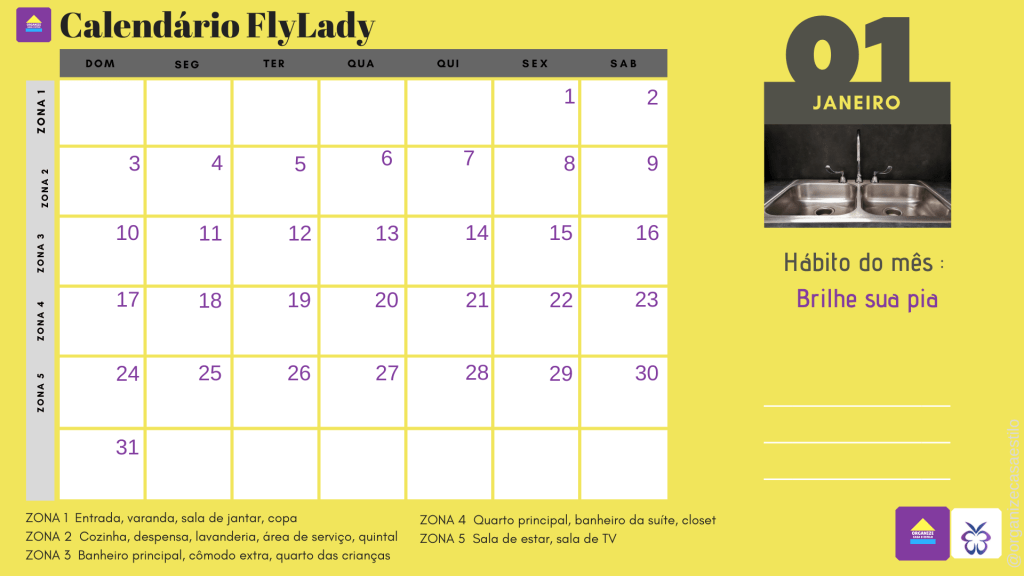 O calendário também nos lembra qual é o hábito do mês eleito pela FlyLady, aquele para o qual você deve dar um pouco mais de atenção ao longo de todo o mês, sem esquecer dos outros hábitos importantes e saudáveis que você já construiu, é claro! É pra quem já consolidou a prática poder aprimora-la. E pra quem não a desenvolveu ainda, ter nova chance de implantar.